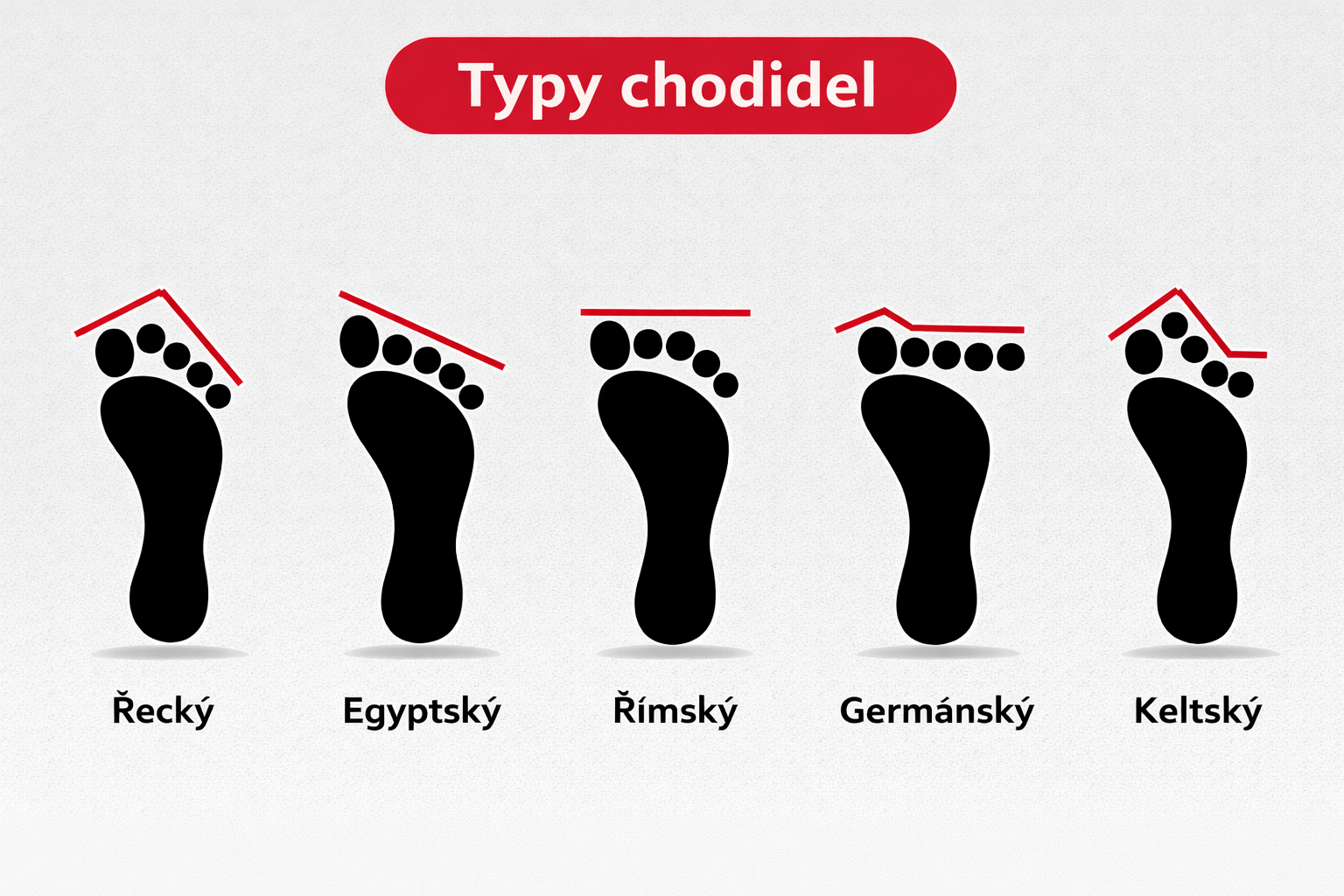 Základný typ vašej nohy môžete ľahko určiť doma. Stačí, keď sa bosí postavíte na papier a obkreslíte tvar vašej nohy. Typ vašej nohy môžete ľahko určiť na základe dĺžky prstov.