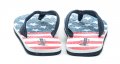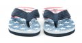 Letná rekreačná nazúvacia obuv s úchopom medzi prstami, vyrobená z kombinácie textilného a syntetického materiálu.