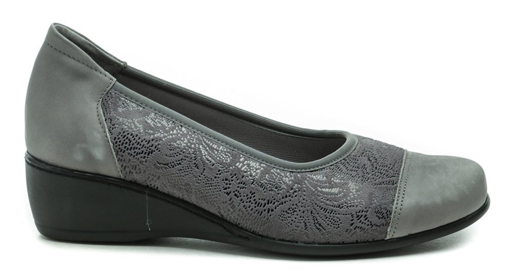 Dámska celoročná zdravotná vychádzková obuv typu lodičky na kline. Obuv je vyrobená z pravej prírodnej kože v kombinácii so strečovým materiálom na priehlavku čo je vhodné pre chodidlo s haluxy.