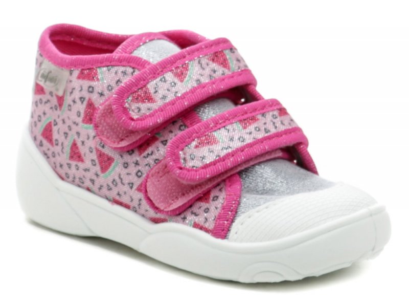 Detská celoročná vychádzková voľnočasová členková obuv sa zalepovaním na dva pásiky so suchým zipsom.