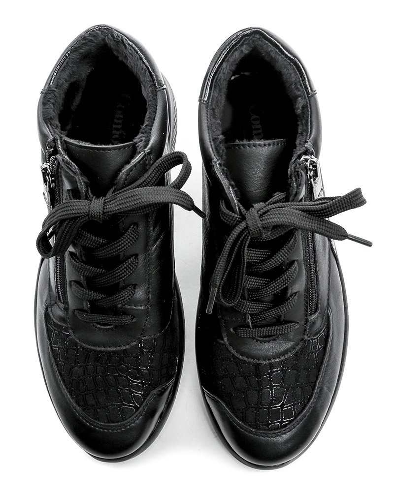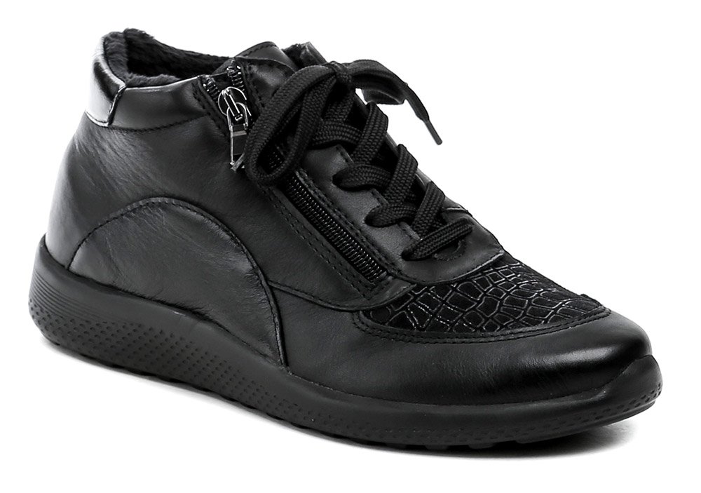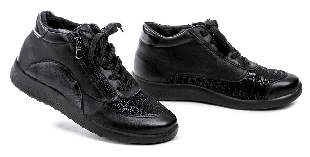 Dámska zimná vychádzková zdravotná obuv so šnurovaním aj zapínaním na zips. Obuv je vyrobená z pravej prírodnej kože v kombinácii s textilným pružným materiálom vhodným pre haluxy.