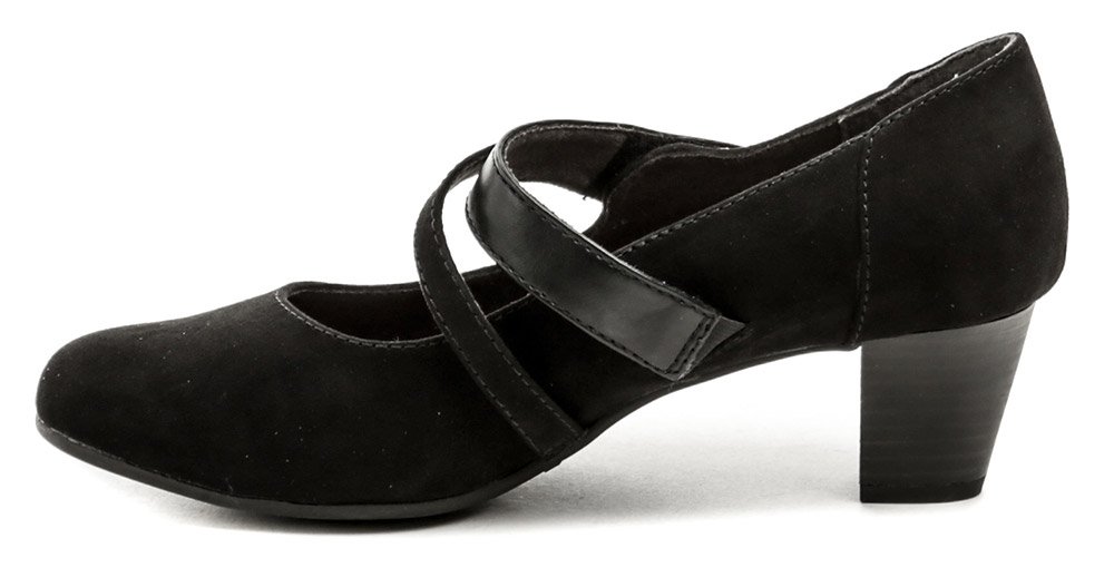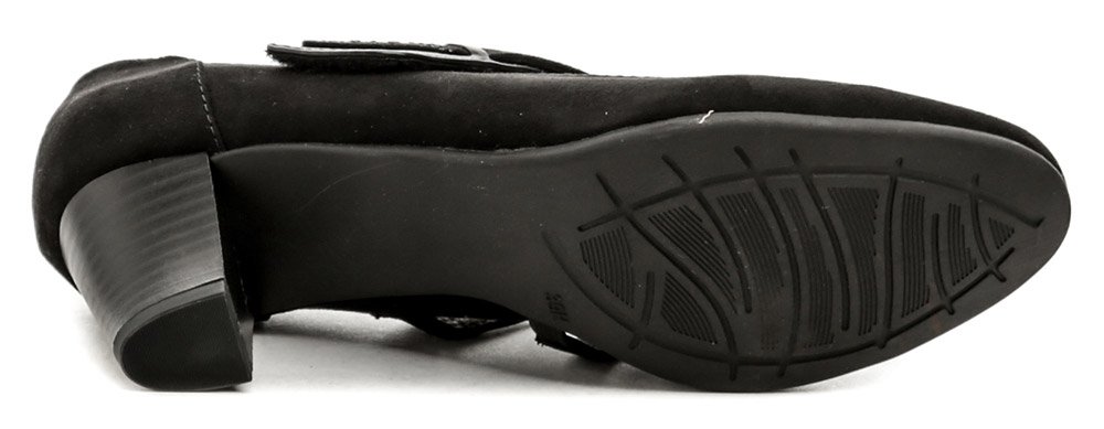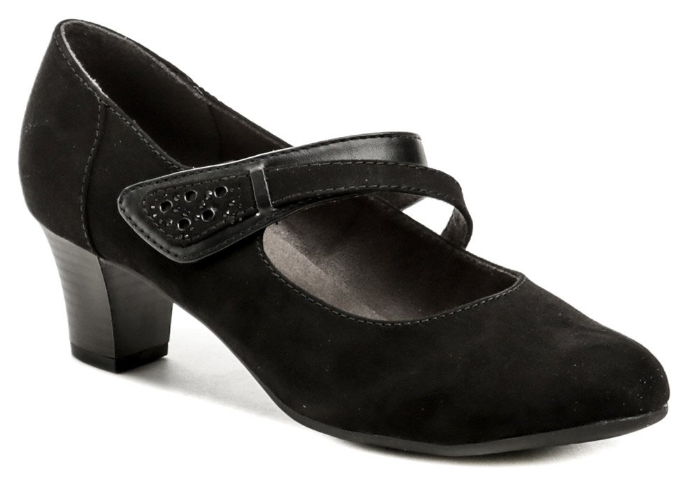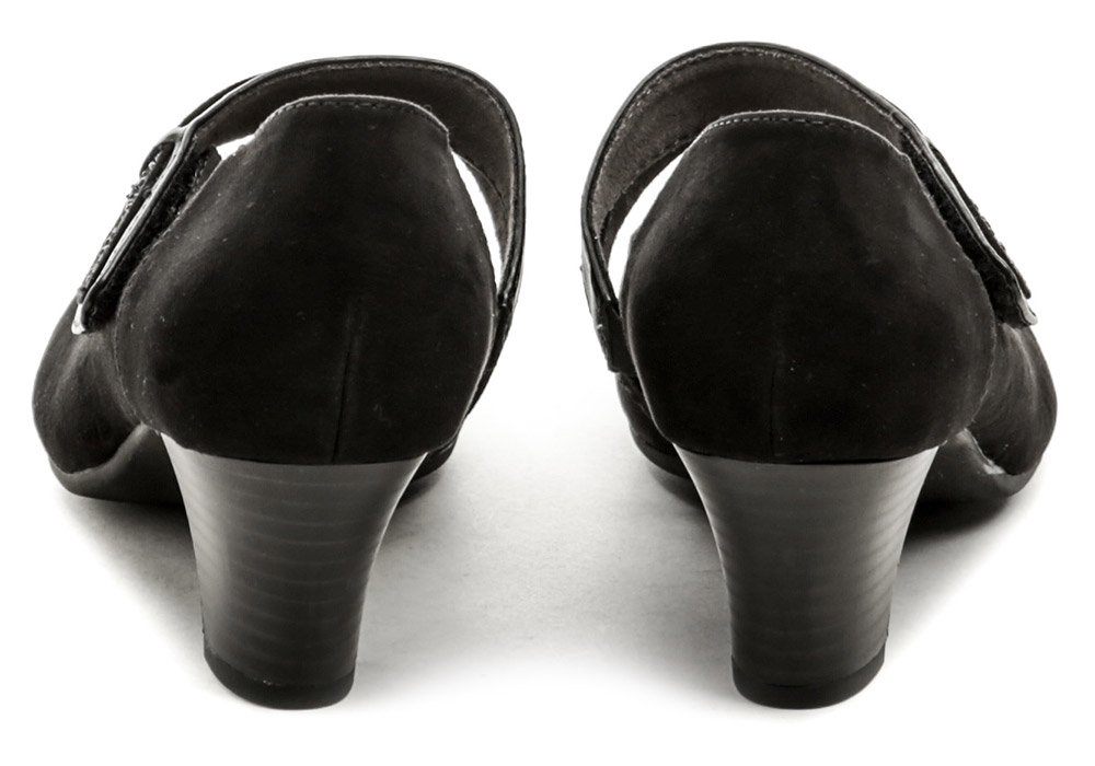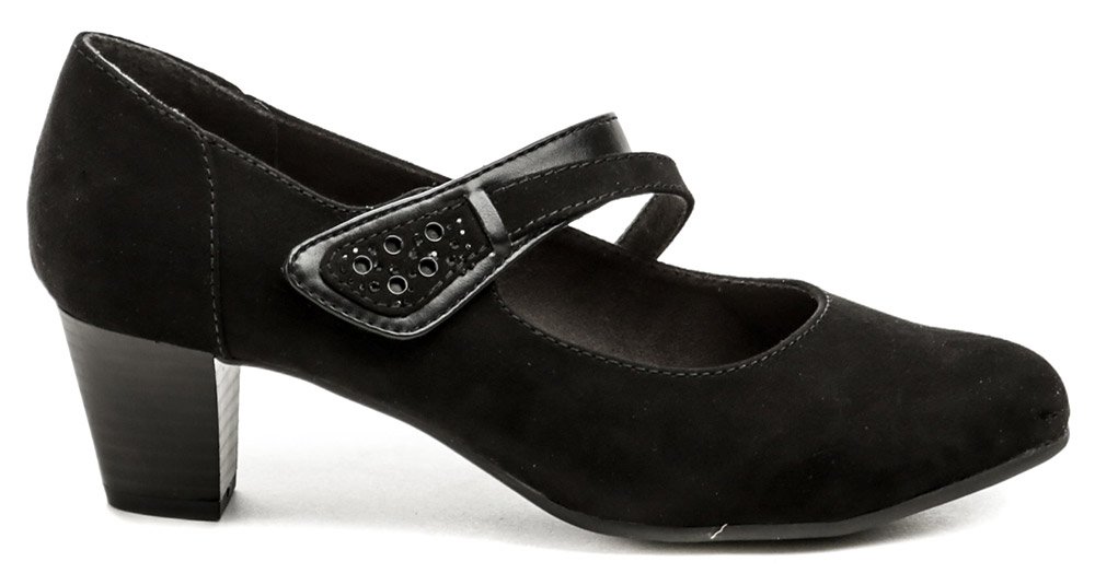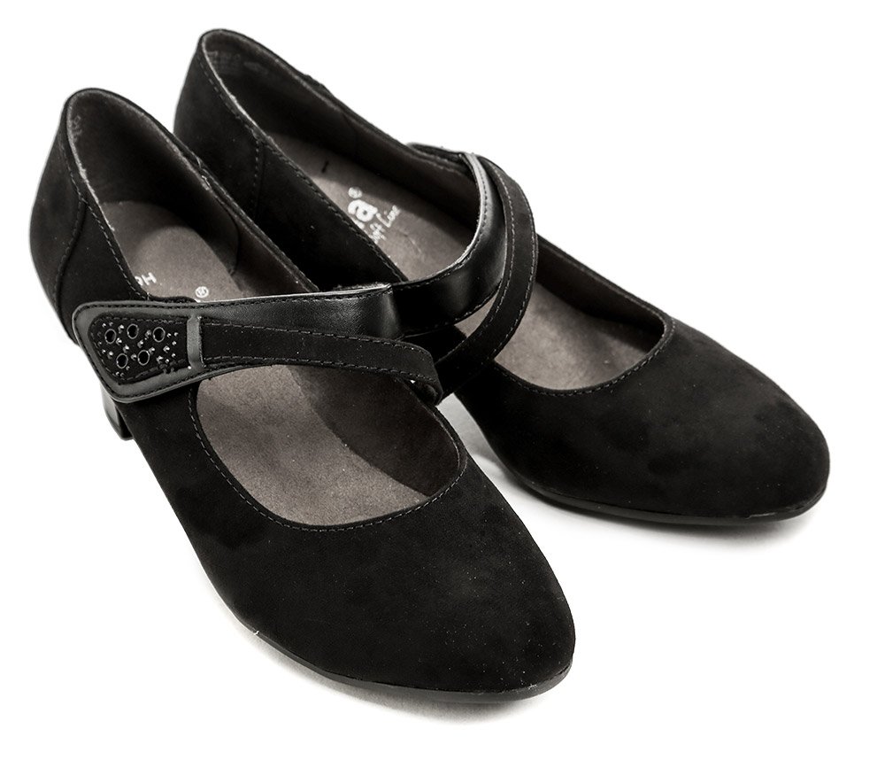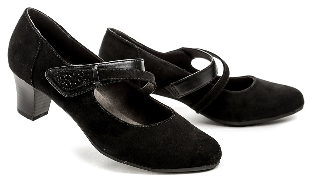 Dámska celoročná vychádzková obuv na stabilnom podpätku s pásikom cez priehlavok so suchým zipsom.