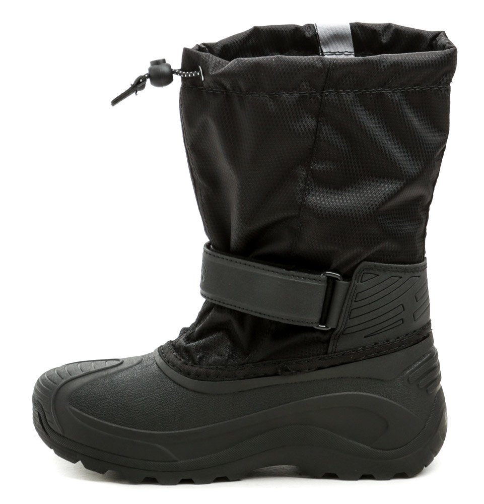 Detská zimná vyteplená nepremokavá obuv s uťahovaním na gumovú šnúrku so zipsom a so zapínaním na suchý zips okolo členku.