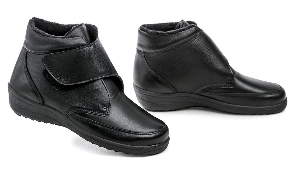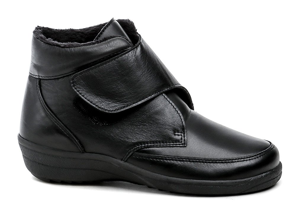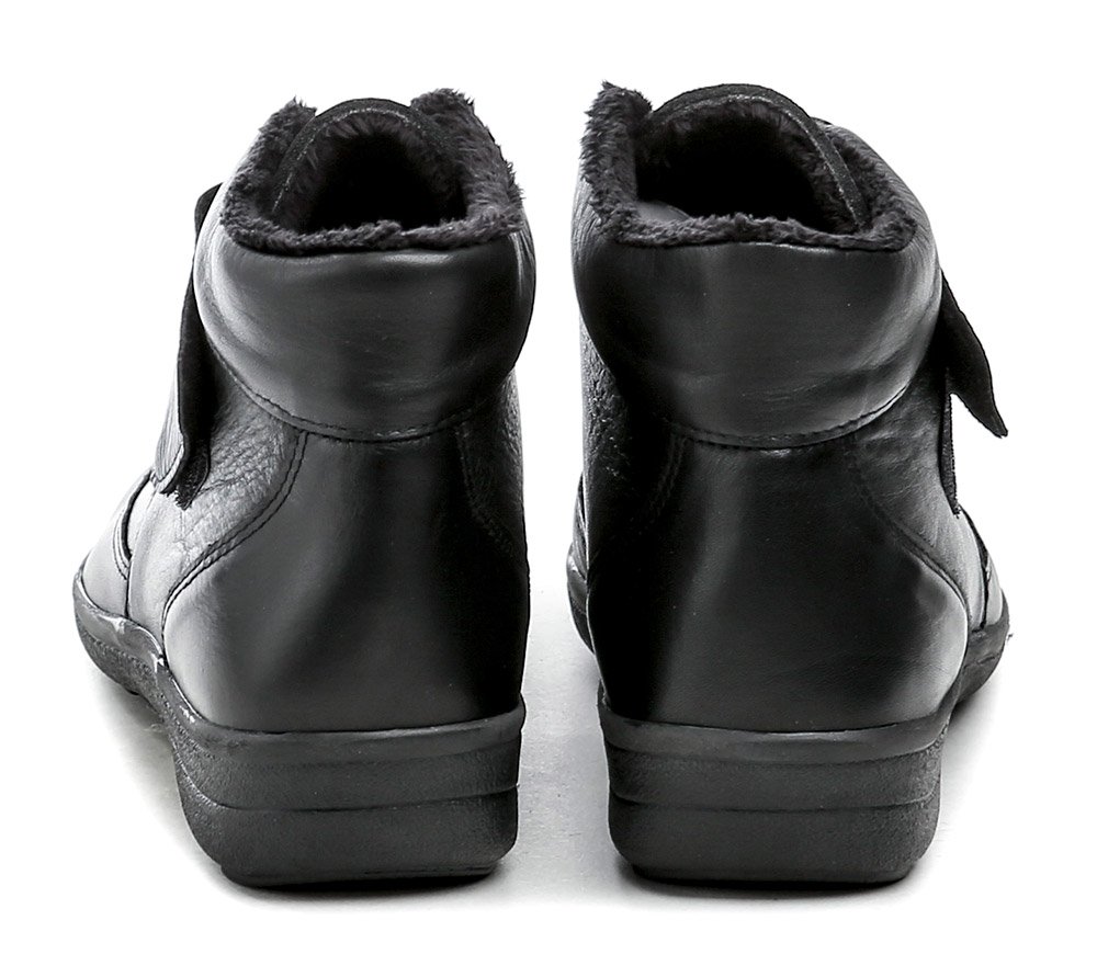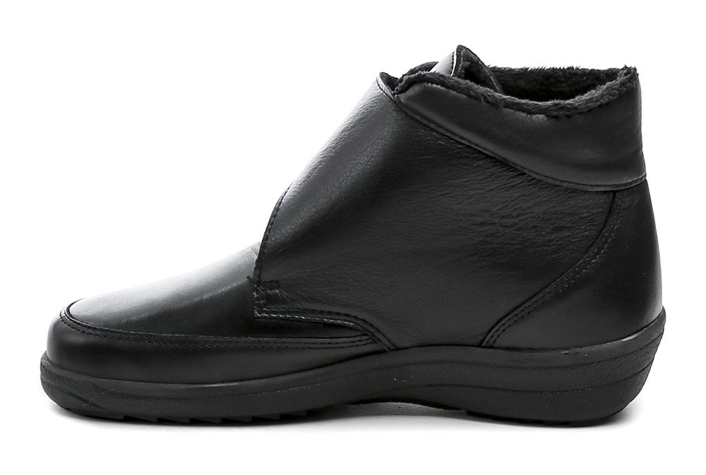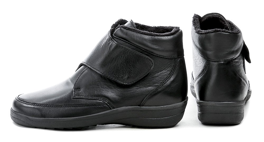 Dámska zimná členková vychádzková zdravotná obuv so zapínaním na suchý zips. Obuv je vyrobená z kombinácie pravej prírodnej kože a syntetického pružného materiálu vhodného pre halluxy a široké chodidlá.
