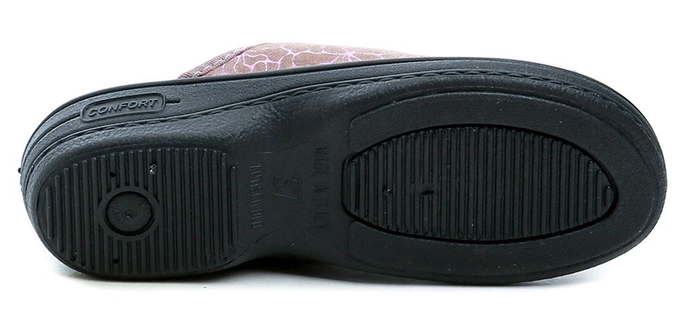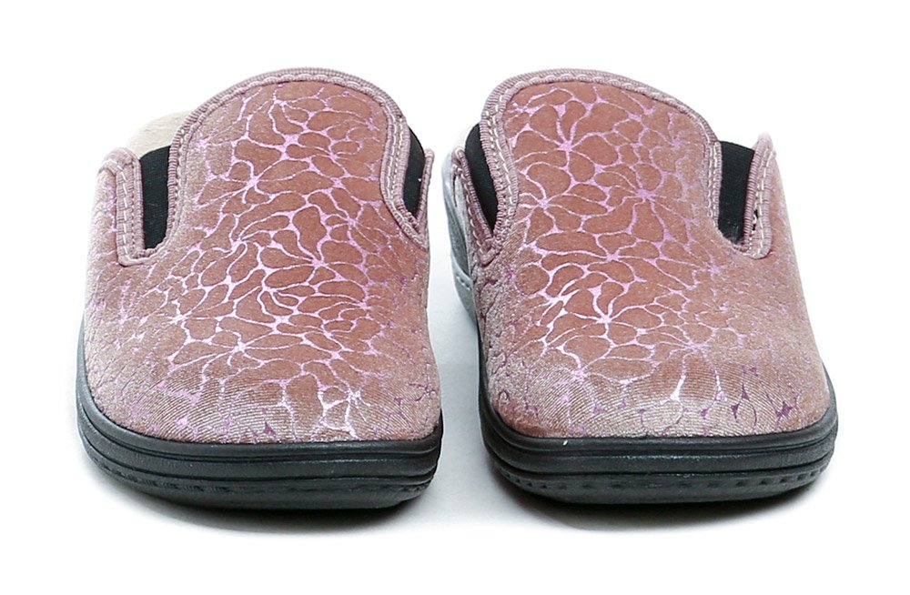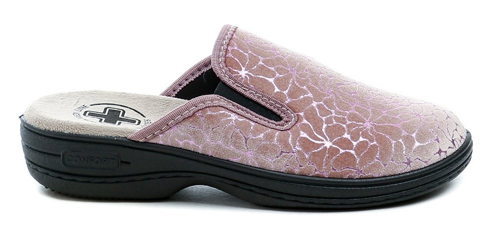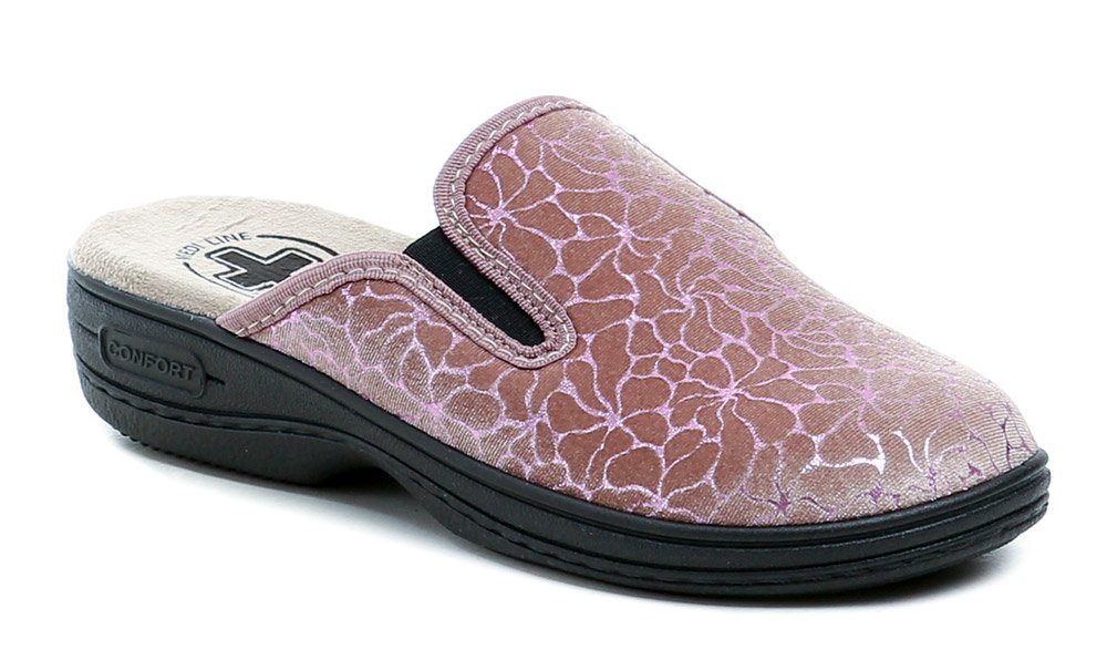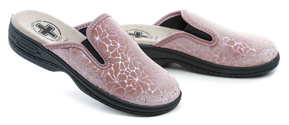 Dámska celoročná domáca zdravotná obuv na miernom kline, vyrobená z pružného textilného materiálu vhodného pre chodidlá s haluxmi a stielkou z textilného materiálu.
