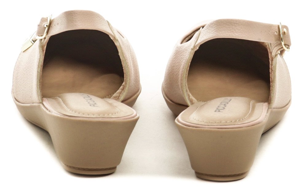 Dámska letná vychádzková obuv s plnou špicou, na miernom kline, so zapínaním na opasok okolo päty s pružnou gumičkou pre ľahké obúvanie.