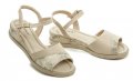 Dámska letná vychádzková obuv s voľnou špicou, na miernom stabilnom kline, so zapínaním na opasok okolo členku.