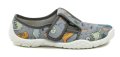 Detská celoročná rekreačná voľnočasová a prezuvková obuv na suchý zips, vyrobená z textilného materiálu so stielkou z pravej prírodnej kože.