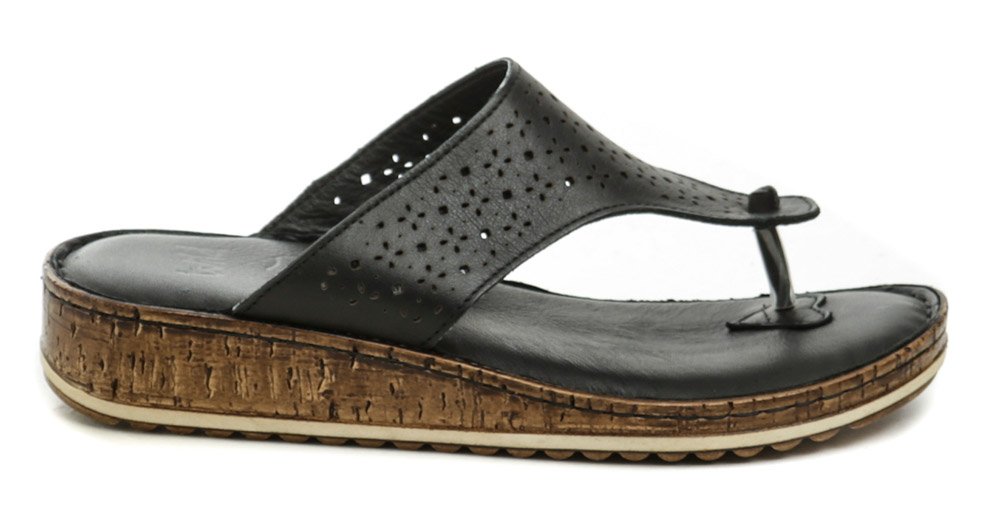 Dámska letná vychádzková obuv na miernom kline typu nazúvaky s úchopom medzi prstami.