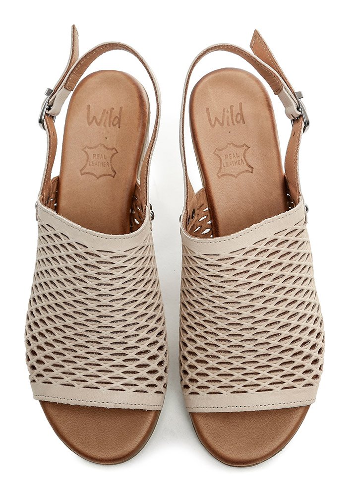 Dámska letná vychádzková obuv na kline s voľnou špicou so zapínaním na opasok okolo päty.