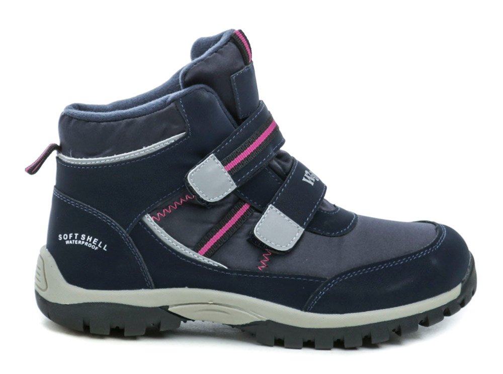 Detská jesenná a jarná členková obuv so zapínaním na suchý zips, vyrobená z kombinácie syntetického a softshellového materiálu a vo vnútri vybavená textilnou podšívkou.