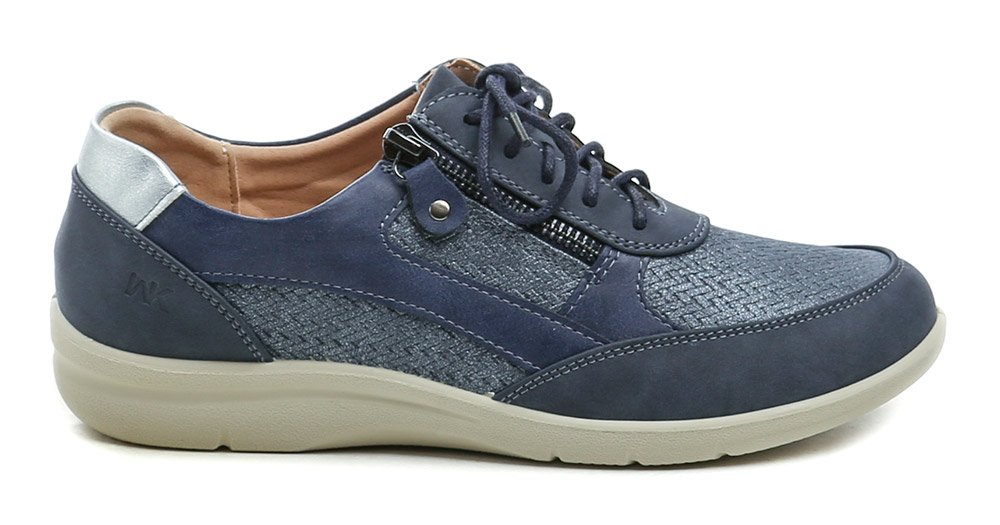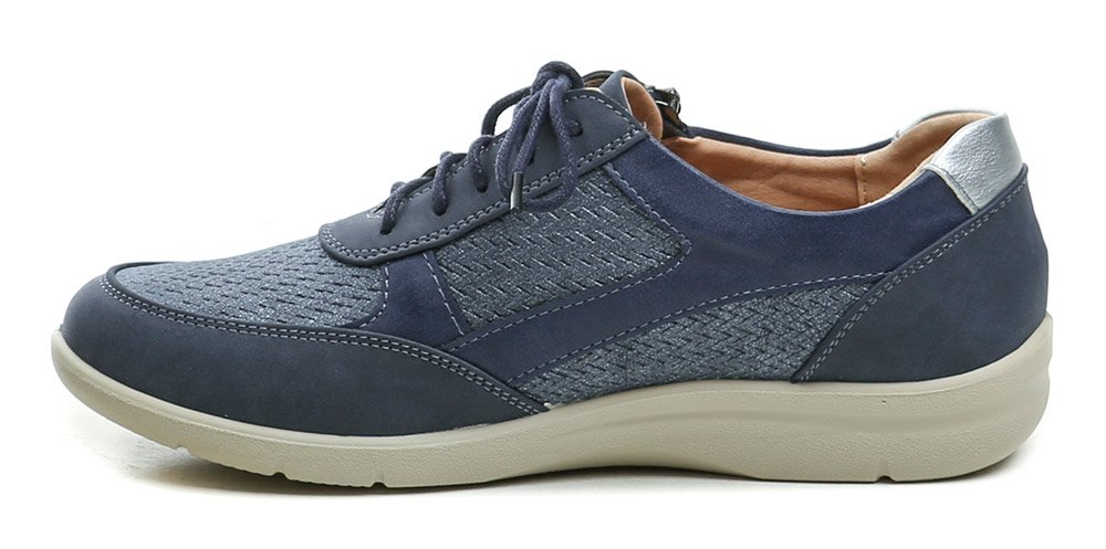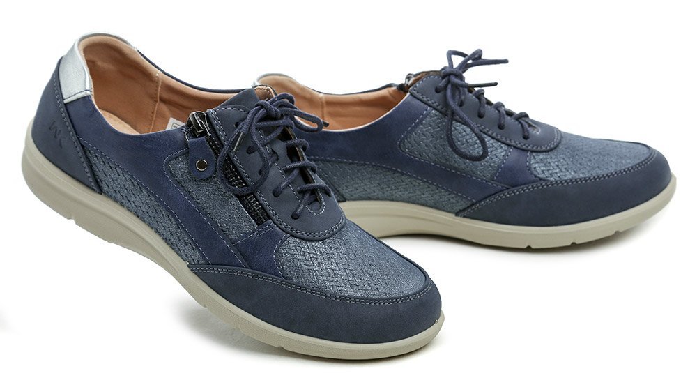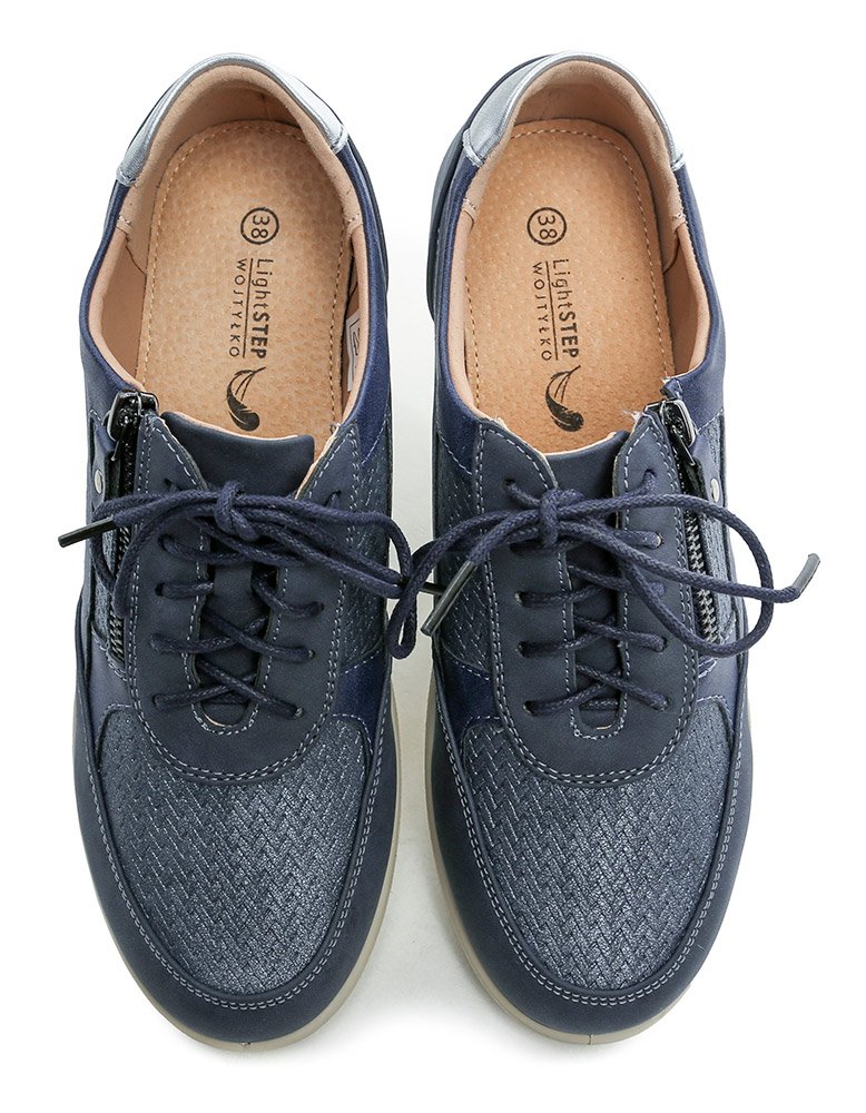 Dámska celoročná vychádzková obuv na šnurovanie aj zapínaním na zips, vyrobená zo syntetického materiálu v kombinácii s prírodnou kožou.